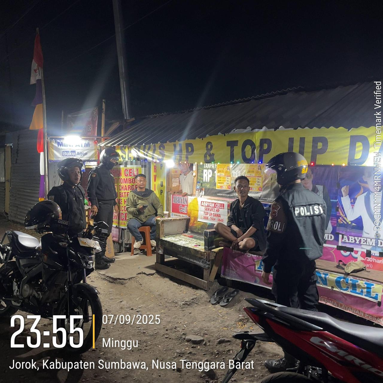 Sumbawa Besar, NTB — Unit Patroli Satuan Samapta (Sat Samapta) Polres Sumbawa terus mengintensifkan patroli keamanan di wilayahnya. Pada Minggu (7/9) malam, tim patroli yang dipimpin oleh Briptu Rahman Sadri berpatroli di kawasan Jorok, Kecamatan Unter Iwes, dalam rangka Patroli Kegiatan Rutin yang Ditingkatkan (KRYD) 2025.