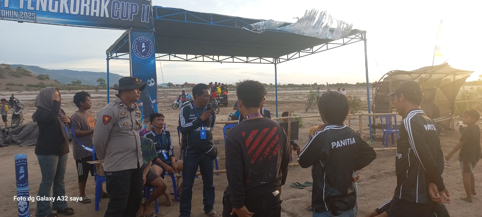 Bhabinkamtibmas bersama sejumlah personel. Dalam kesempatan tersebut, memberikan imbauan kepada panitia, pemain, dan penonton untuk menjaga keamanan serta sportivitas selama turnamen berlangsung.