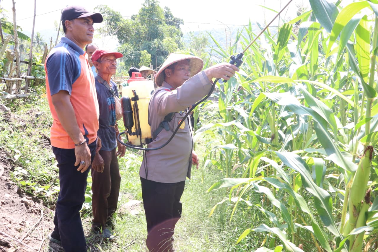 Kapolres bersama para Pejabat Utama Polres Sumbawa Barat dan didampingi Kelompok Tani Paruak Jaran melaksanakan penyemprotan pupuk hibrida secara langsung di lahan jagung binaan.
