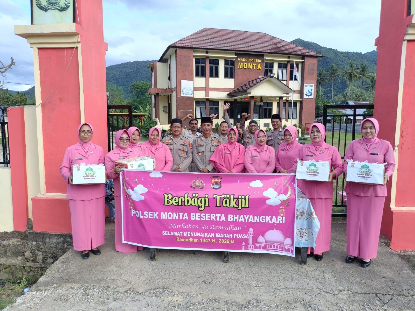 Kehadiran personil dan pengurus Bhayangkari Ranting Monta yang di pimpin oleh Kapolseknya AKP Sudarto SH itu membagikan takjil berbuka puasa.