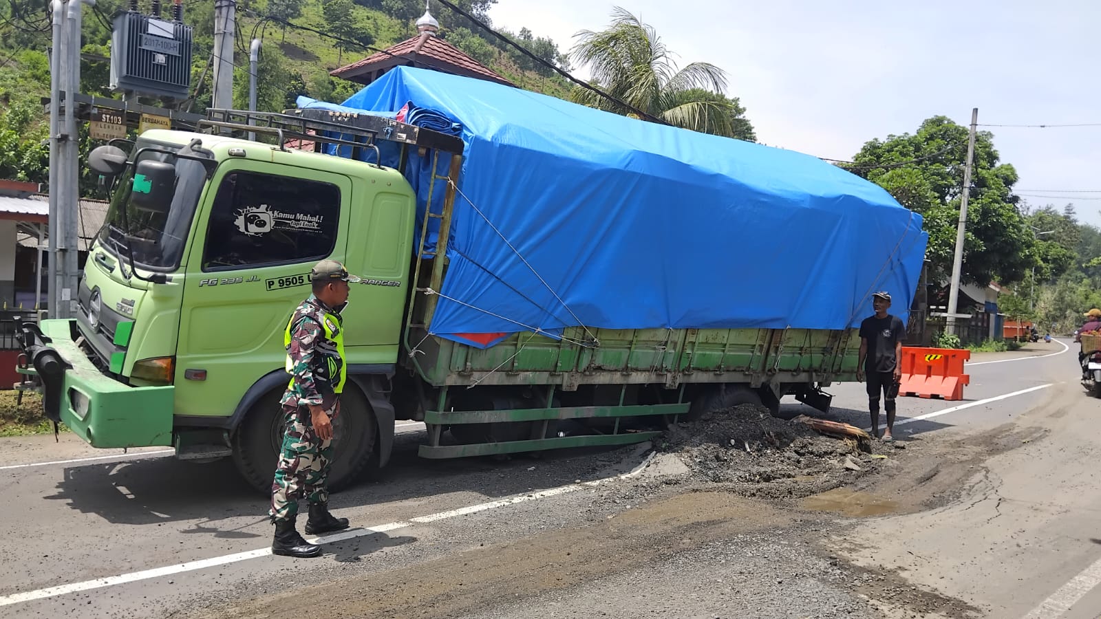 Peristiwa tersebut terjadi saat sebuah truk besar bermuatan gula seberat ±23 ton mengalami amblas pada roda belakang kiri hingga tertanam sekitar 30 sentimeter. Kejadian ini berpotensi mengganggu kelancaran arus lalu lintas, khususnya jalur vital menuju Pelabuhan Gilimas yang menjadi pusat aktivitas bongkar muat logistik.
