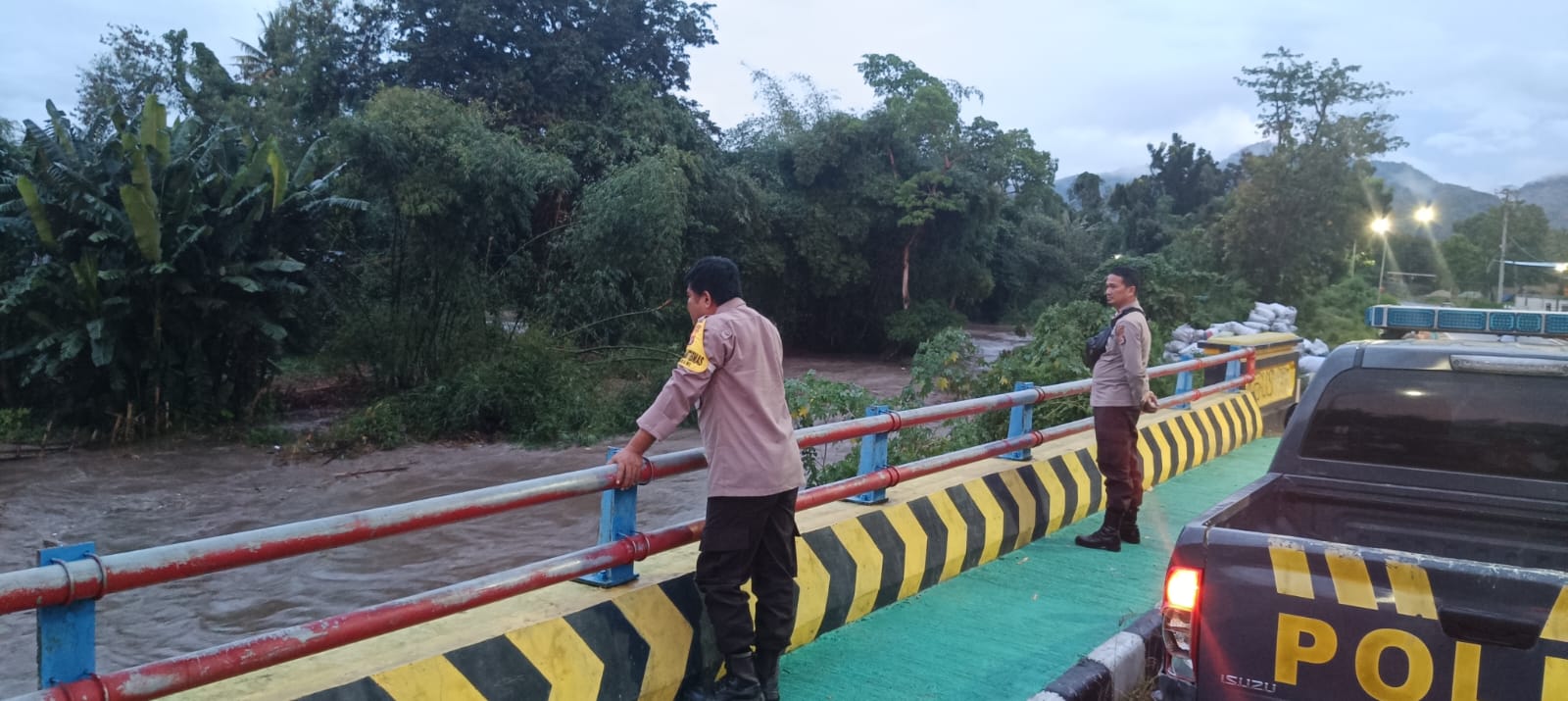 Memasuki pukul 18.00 WITA, debit air dilaporkan mulai surut. Personel Bhabinkamtibmas bersama warga turut membantu proses evakuasi barang serta memastikan kondisi lingkungan tetap aman dan kondusif.