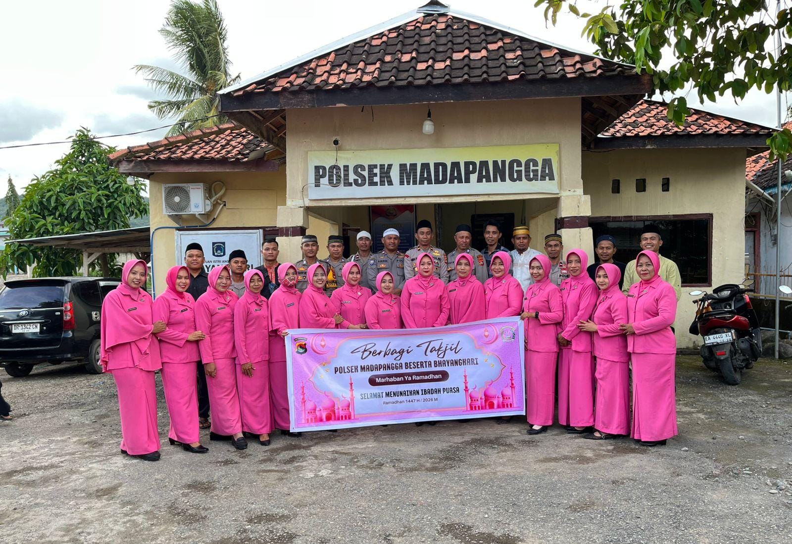 Suasana kebersamaan terlihat di depan Mapolsek Madapangga Polres Bima Kabupaten Polda NTB dengan berjejernya Personel dan Bhayangkari pada Jum,at sore 13 Maret 2026.