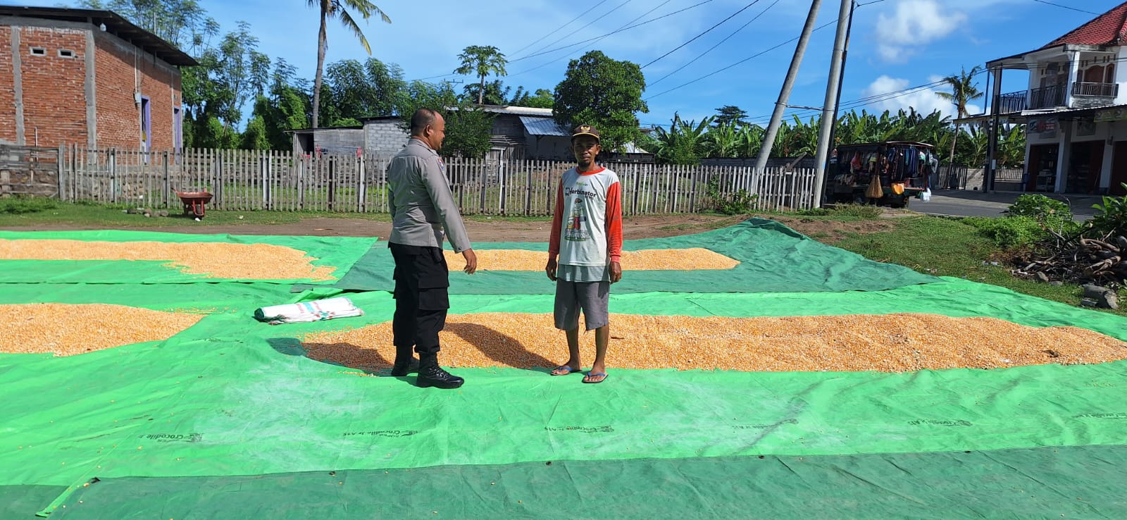 Dalam kegiatan tersebut, BRIPKA Mahsup menyambangi warga binaannya yang tengah menjemur hasil panen jagung. Pemantauan dilakukan terhadap lahan milik Firdaus (41), dengan luas sekitar 2 hektar yang ditanami jagung hibrida varietas ADV JALU. Tanaman jagung tersebut telah memasuki usia 120 hari dan berada pada masa panen di bulan April 2026, dengan estimasi hasil mencapai ±16 ton.