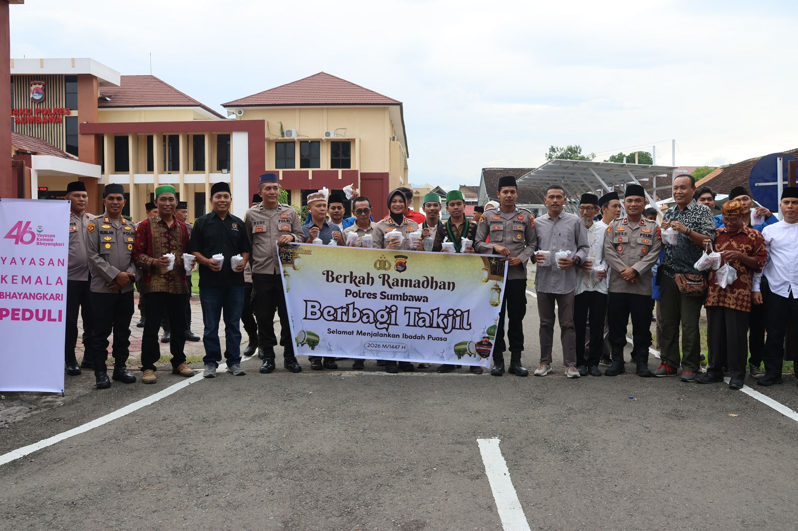 Rangkaian acara dimulai sejak pukul 17.30 WITA, diawali dengan aksi turun ke jalan yang dipimpin langsung oleh Kapolres Sumbawa, AKBP Marieta Dwi Ardhini, S.H., S.I.K., Wakapolres Sumbawa Kompol Didik Hariyanto, S.H., bersama jajaran PJU dan Bhayangkari, Kapolres membagikan takjil kepada masyarakat pengguna jalan di depan Mako Polres sebagai bentuk implementasi kepedulian Polri di bulan Ramadan.