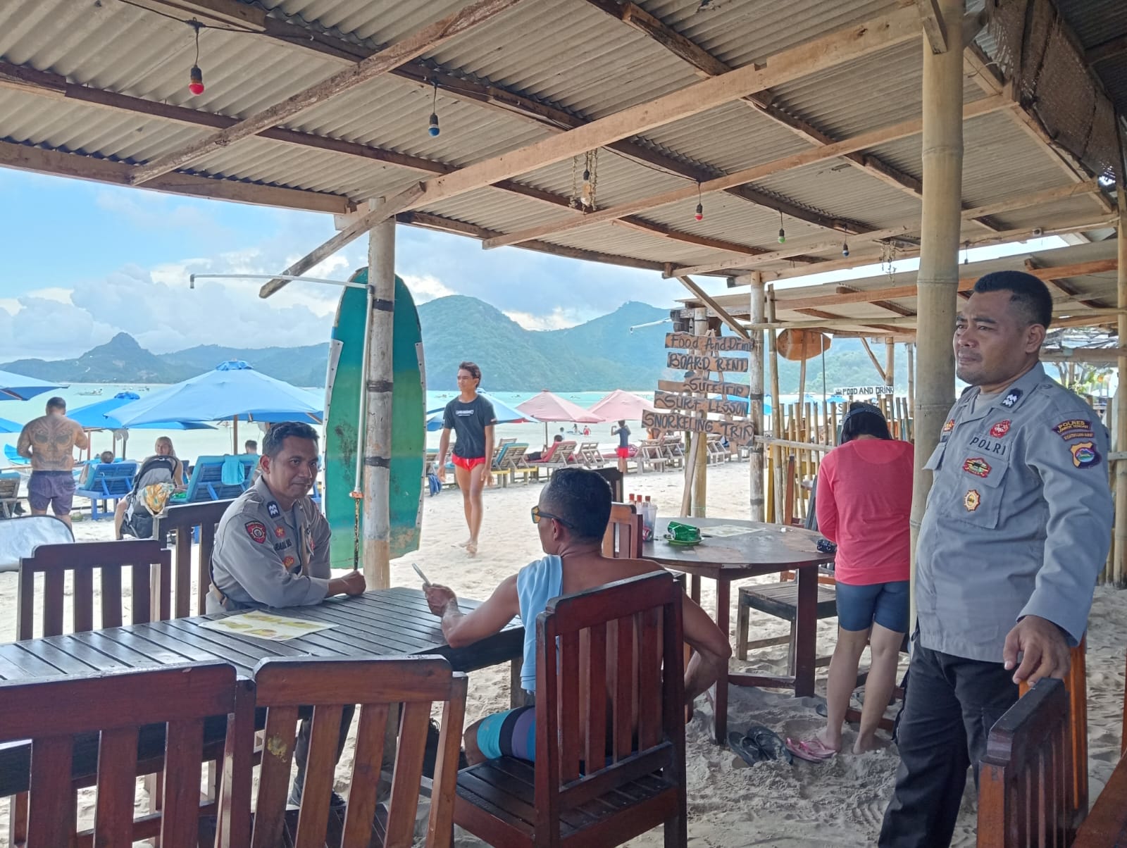 Lombok Tengah (NTB) – Personel piket Pos Polisi Selong Belanak, Polsek Praya Barat, Polres Lombok Tengah, meningkatkan patroli siang di kawasan wisata Pantai Selong Belanak sebagai upaya menjaga keamanan dan ketertiban masyarakat, sekaligus memberikan rasa aman bagi wisatawan yang berkunjung.