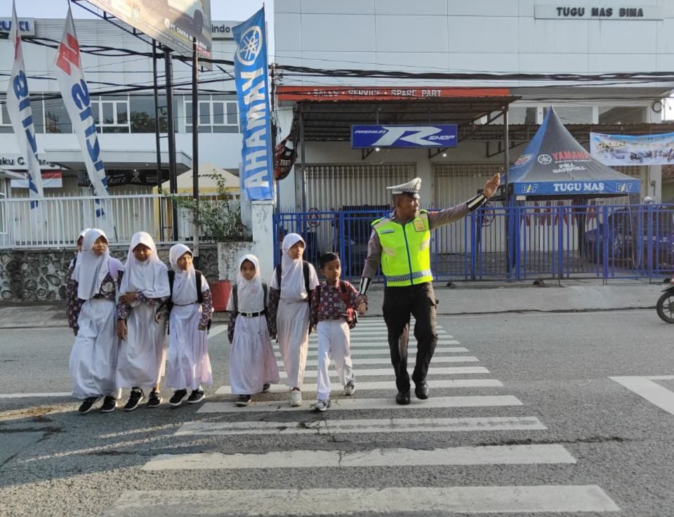 Satlantas Polres Bima Kota Laksanakan Rawan Pagi, Bantu Anak Sekolah dan Pejalan Kaki Menyeberang Jalan