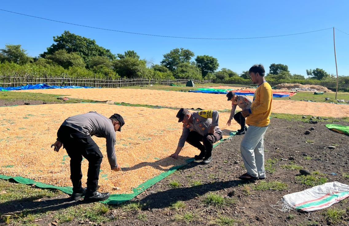 Bhabinkamtibmas Polsek Tambora bersama personel Bakomsus ketahanan pangan Satbinmas Polres Bima Kabupaten Polda NTB melaksanakan pengecekan dan membantu warga menjemur jagung.
