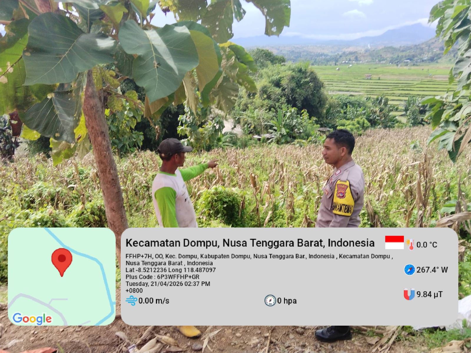 Dalam rangka mendukung pelaksanaan program ketahanan pangan nasional menuju Indonesia Emas 2045, Bhabinkamtibmas (BKTM) Desa O’o, Polsek Dompu, BRIPKA Ady Soepriadin, S.H., melaksanakan kegiatan pemantauan lahan jagung milik warga binaannya pada Selasa (21/04/2026) pukul 14.00 Wita hingga selesai, bertempat di Dusun Kala Timur, Desa O’o, Kecamatan Dompu, Kabupaten Dompu.